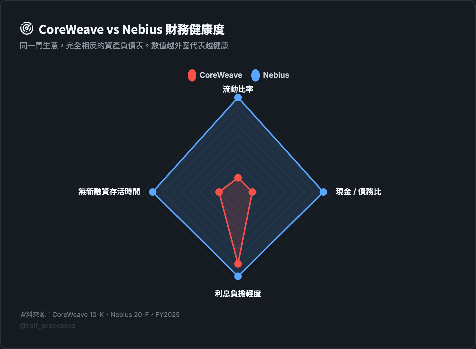 CoreWeave 和 Nebius 做的是同一門生意,但每 $1 營收背負的利息成本差了一倍以上。一家流動比率 0.46,另一家 3.08。同一門生意,兩種完全不同的資本結構,決定了誰能撐過 AI的下行週期。