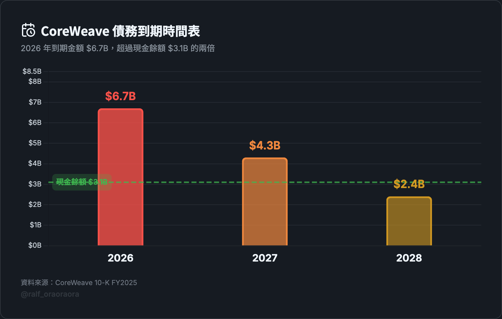 CoreWeave 必須在 2026 年內完成大規模的再融資,否則會面臨流動性問題。