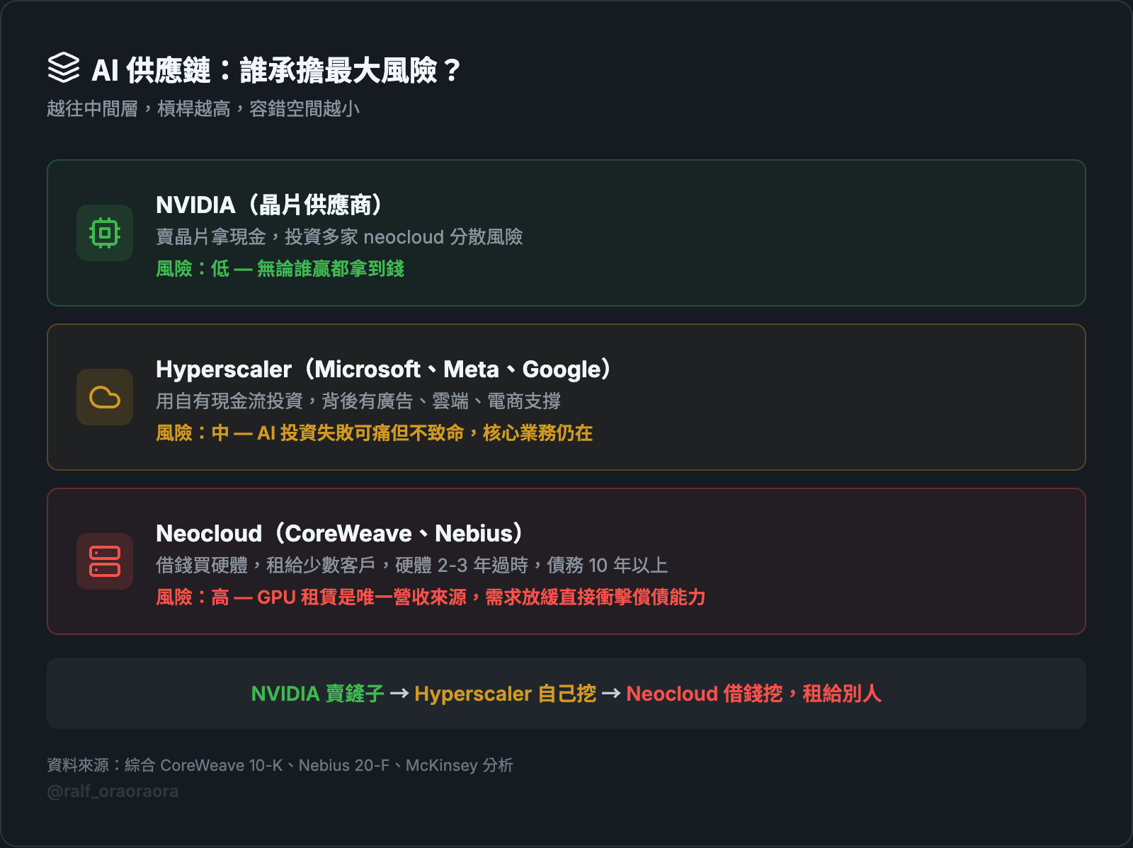 客戶集中度高的另一面是:neocloud 能不能活下去,取決於 hyperscaler 要不要繼續外包。