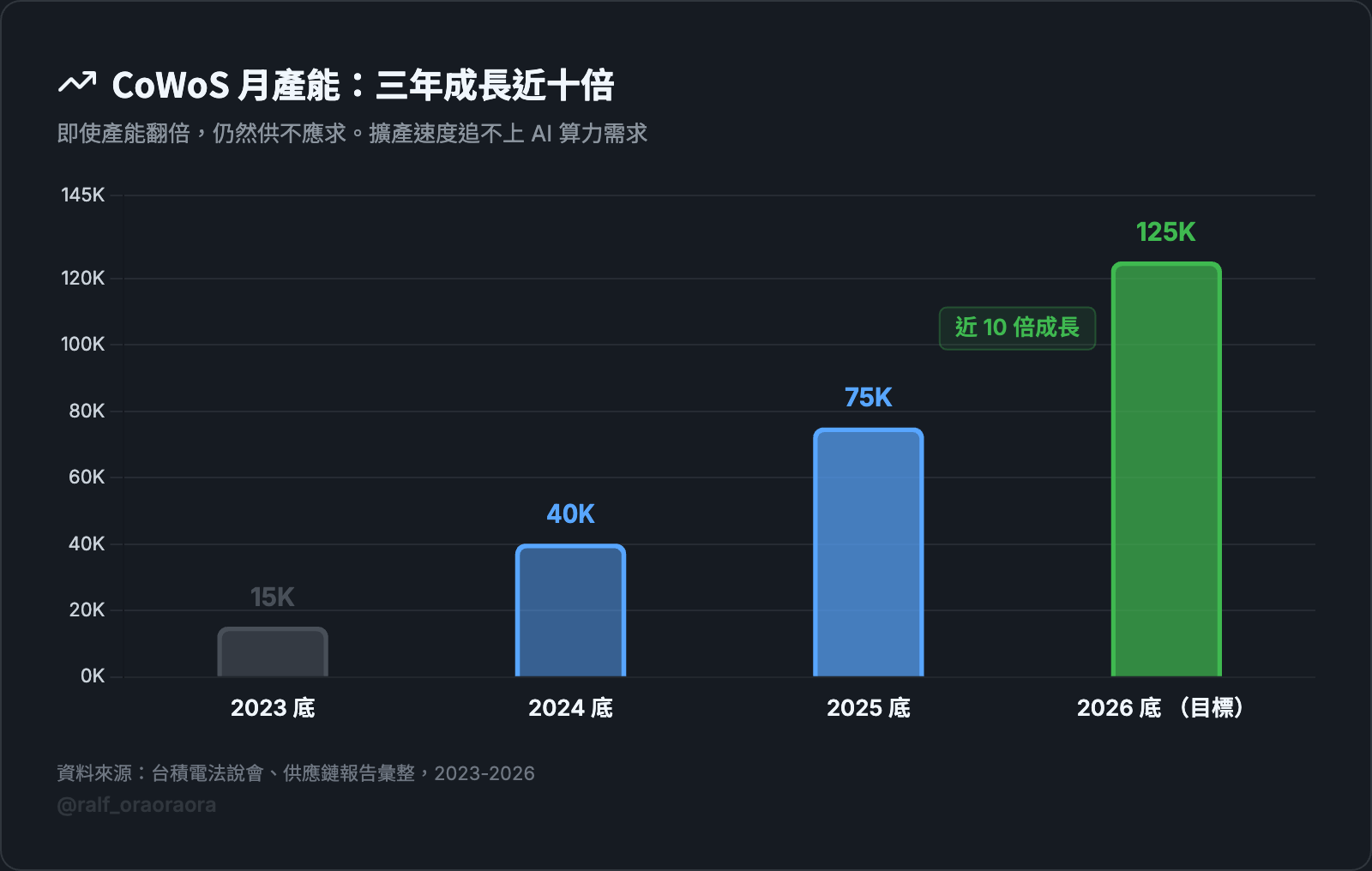 台積電 CoWoS 的月產能,2025 年底大約 75,000 片,目標 2026 年底拉到 120,000 到 130,000 片。跟 2023 年比成長將近十倍。
