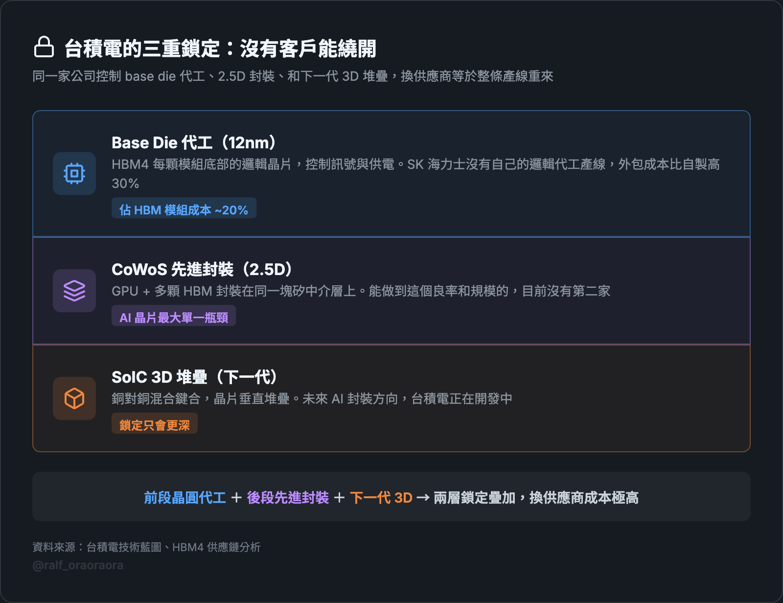 所有人都在討論 Nvidia 的 AI 壟斷。但 Nvidia 的晶片要出貨,得先通過台積電的封裝產線。台積電同時控制封裝產能和 base die 代工,定價方式是「要就接受,不要拉倒」。