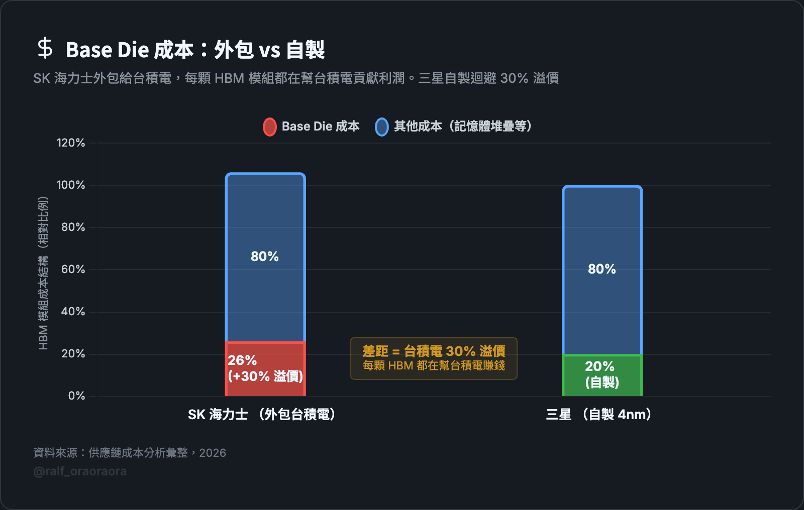 SK 海力士把 base die 外包給台積電,成本比自製高出大約 30%。