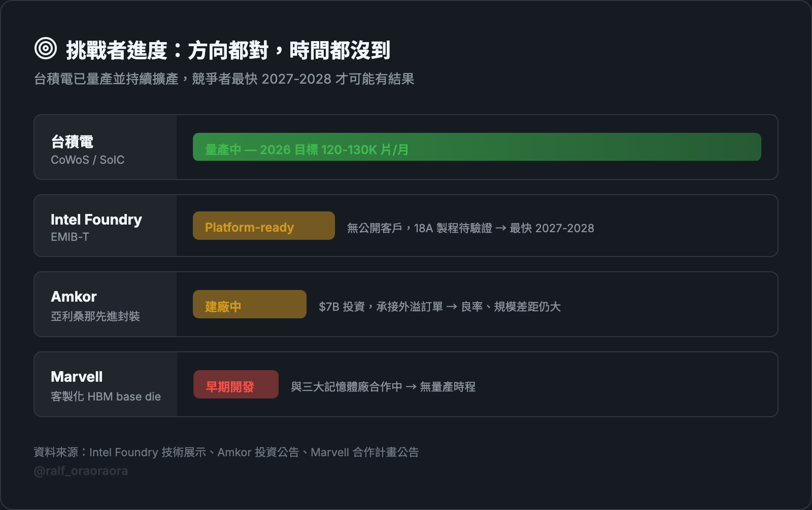 如果有一家主要客戶(例如 Amazon 的自研晶片或某家 ASIC 設計商)選擇 Intel 而不是台積電的封裝,那就是壟斷出現裂縫的第一個訊號。
