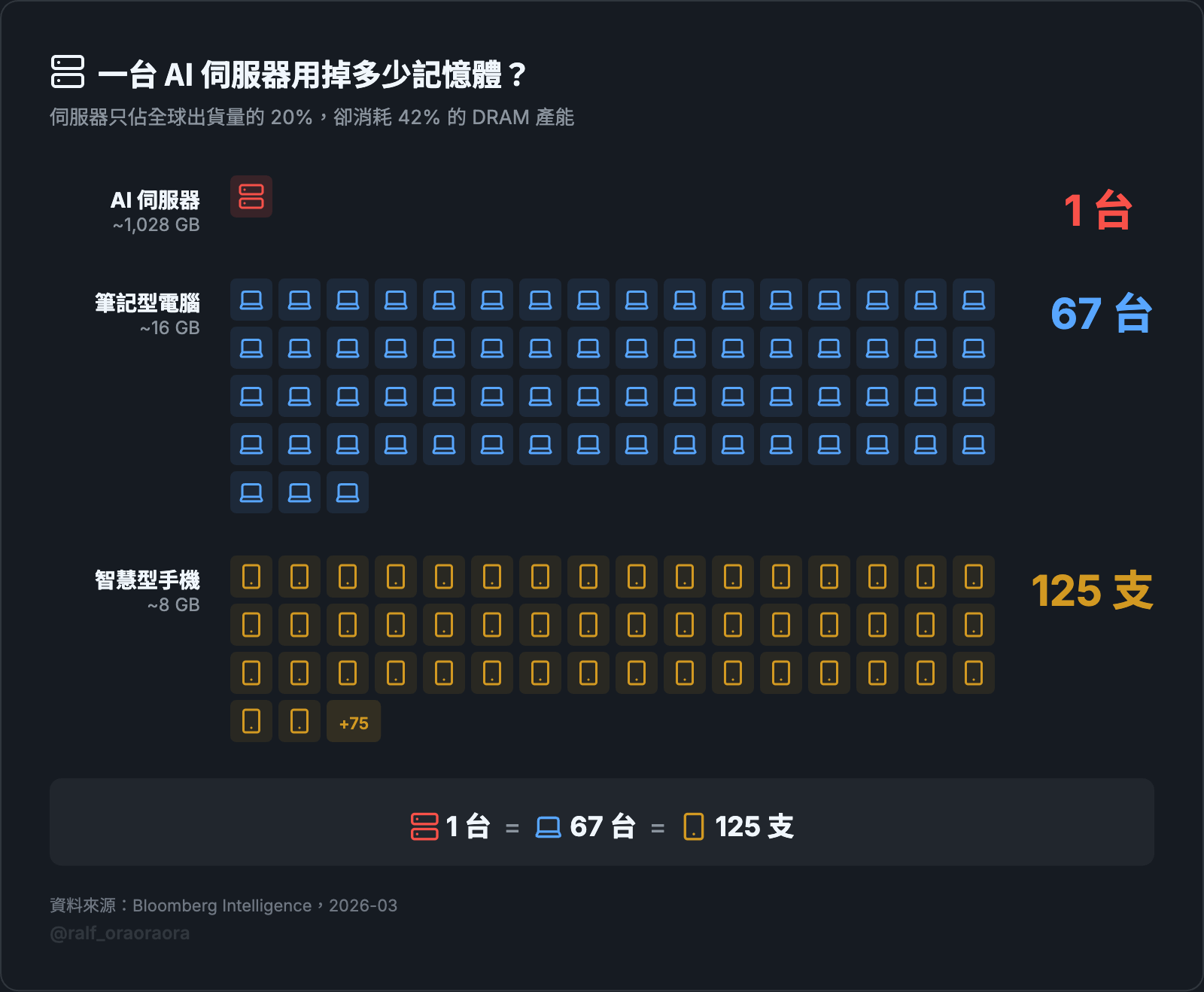 一台 AI 伺服器用掉的記憶體,等於 67 台筆電,或 125 支手機。