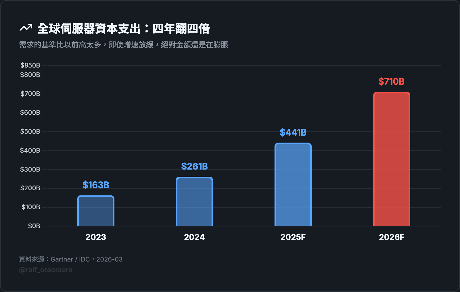 全球伺服器資本支出從 2023 年的 1,630 億美元漲到 2026 年預估的 7,100 億美元。