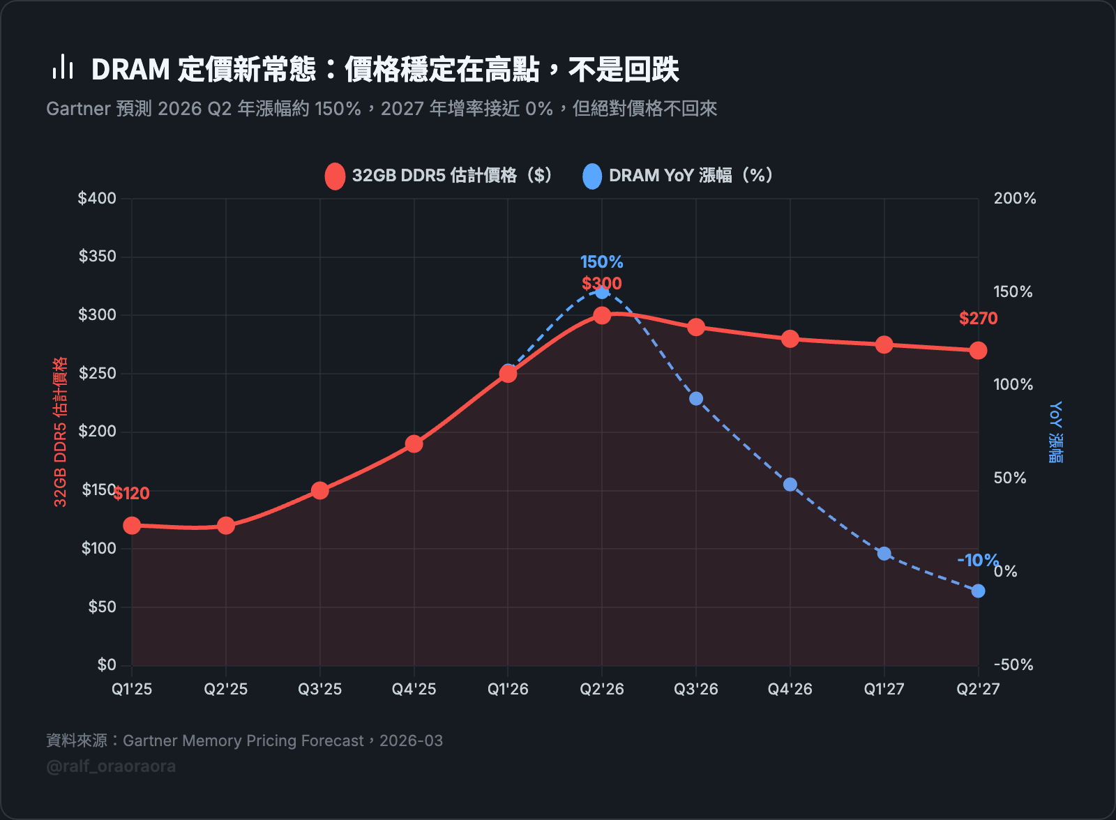 Gartner 預測價格高峰在 2026 年第二季,DRAM 年漲幅約 150%。