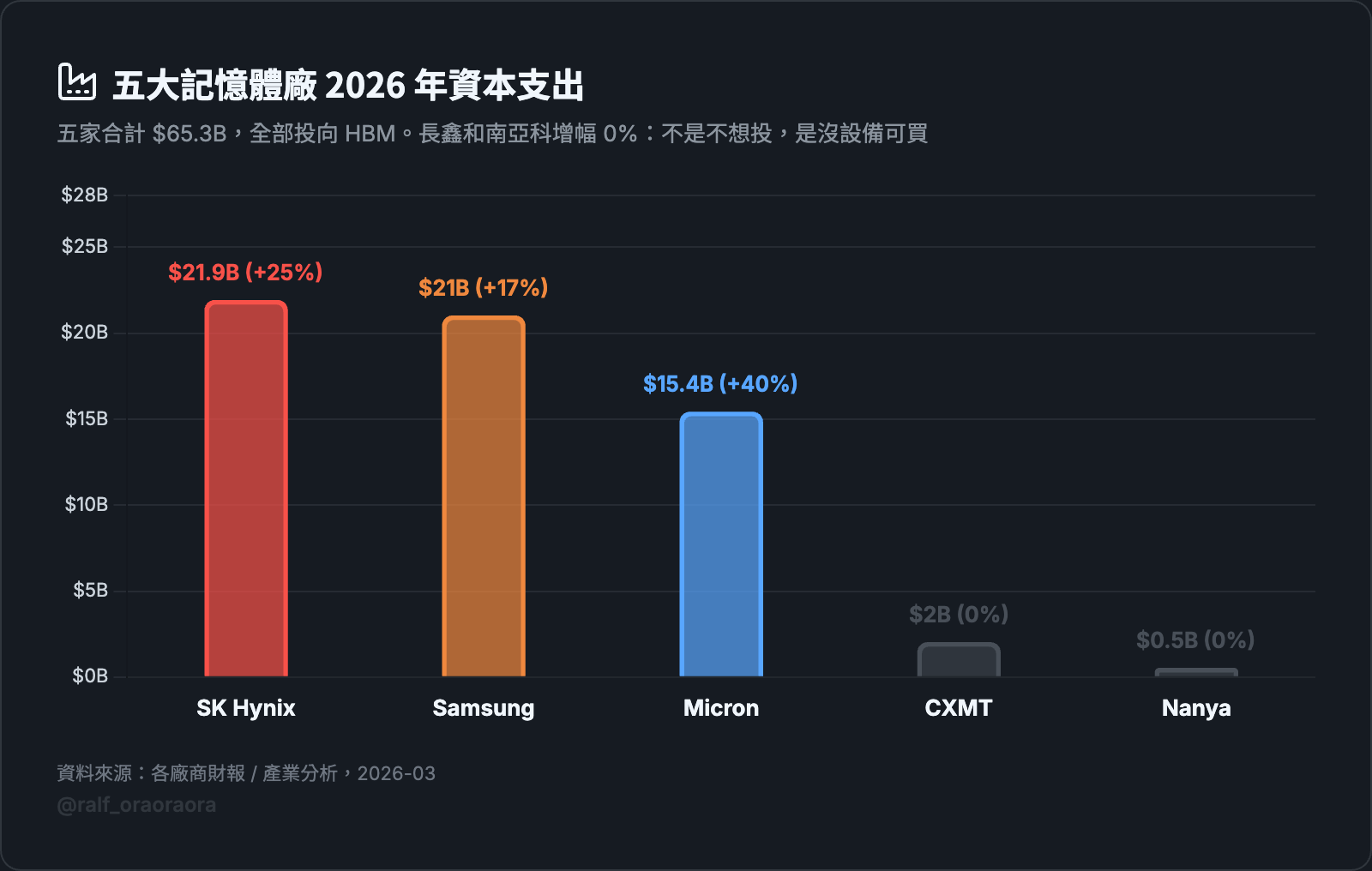 資本支出的數字也說明了:長鑫和南亞科的 CapEx 增幅是 0%。不是不想投,是沒設備可買。