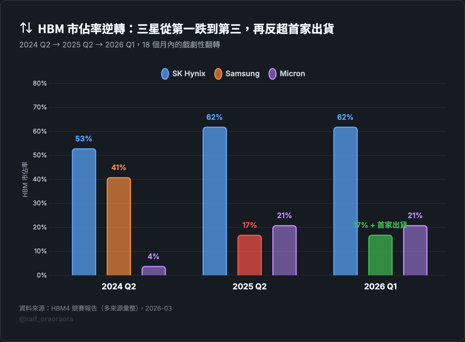 從市占第三到首家出貨 HBM4,中間只隔了 18 個月。