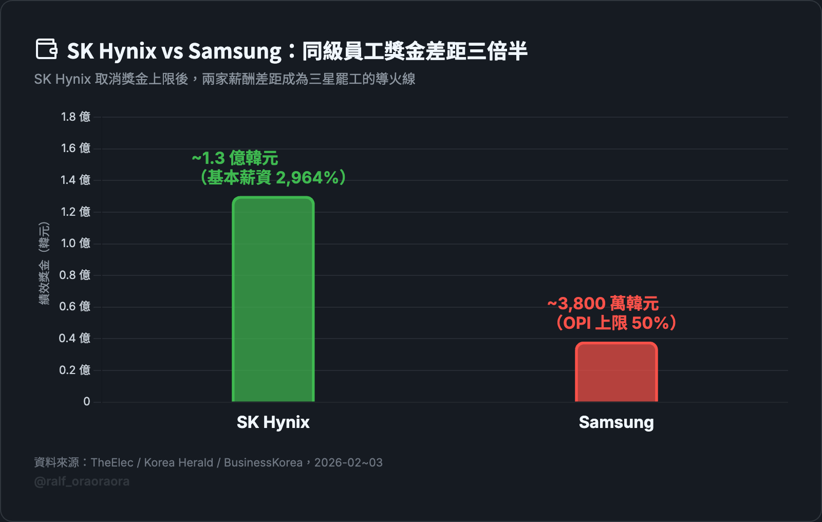 2026 年 2 月結果出來,SK 海力士發出基本薪資 2,964% 的獎金,人均約 1.3 億韓元。